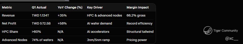 $Taiwan Semiconductor Manufacturing(TSM)$ TSMC just delivered a monster Q1 2026 beat that has the entire semiconductor food chain buzzing, with net profit surging 58% year-over-year to TWD 572.5 billion and revenue climbing 35% to TWD 1.134 trillion — smashing expectations across the board and pushing gross margin to a stellar 66.2%. 😤 The HPC segment, the crown jewel of AI infrastructure, now accounts for over 60% of total revenue, while advanced nodes (3nm and 5nm) make up a record 74% of wafer revenue, proving that hyperscaler demand for cutting-edge capacity remains insatiable. Shares are up roughly 2% in after-hours trading as investors digest the strongest validation yet that AI capex is not only intact but accelerating. This performance sets a powerful tone for the broader earnings season, but the big question is whether TSMC’s dominance as the backbone of AI infrastructure can sustain the rally — or if rising supply chain pressures and potential overcapacity signals are already lurking. Emerging markets are feeling the ripple, with Asia’s chip ecosystem pulling 10% more orders on 5G expansions and Latin America’s data center boom adding 8% compute demand amid global uncertainty. Tariff escalations crimp 5%, but QT’s $1T flood keeps upside alive for resilient holds. Let’s break down the beat, weigh the AI tailwinds, and spot if this is the moment to bet big on TSMC or the cue for caution in 2026. 📉⚡