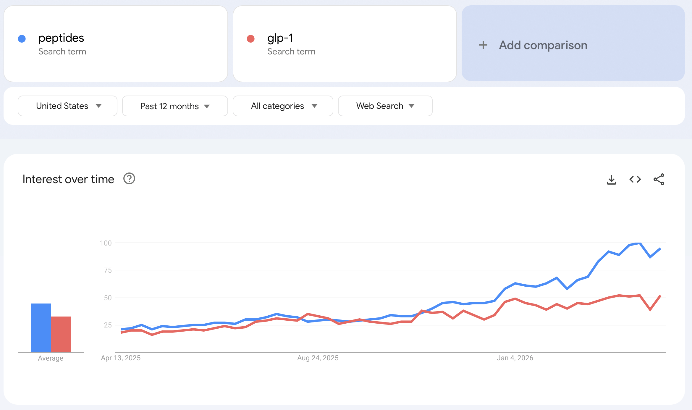 How big is the peptide market? GLP-1s were a $68.9 billion business for Novo Nordisk and $Eli Lilly(LLY)$ in 2025, and interest in peptides is nearly 2x the interest in GLP-1s, according to Google Trends.