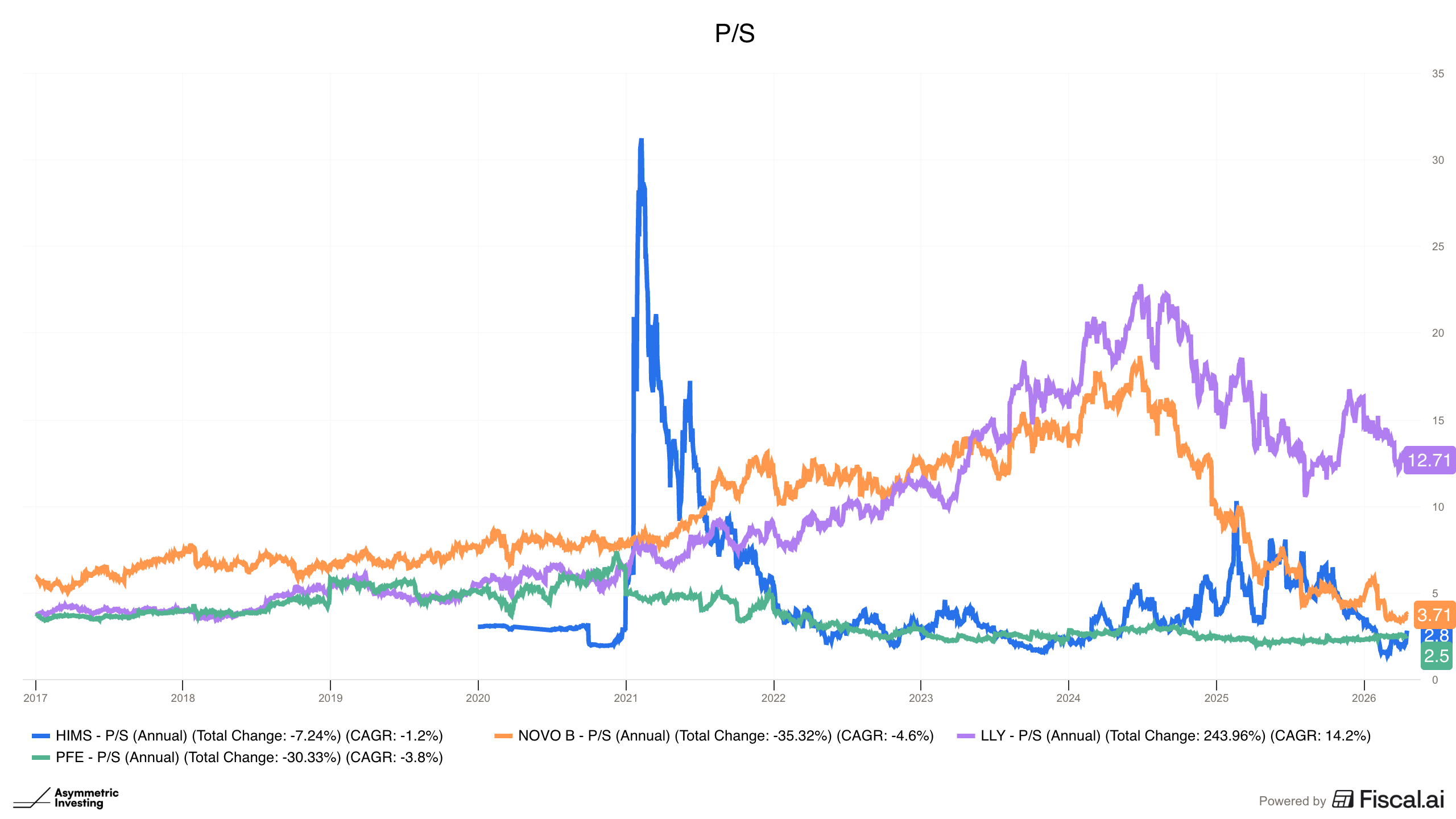 The combination of a deal with Novo Nordisk last month and the peptide announcement drove Hims & Hers’ very, very predictable comeback on the market. I have been highlighting why the perceived risk around Hims & Hers is overblown and put my money where my mouth is by buying the Asymmetric Portfolio nearly every month in the past year, including in March at $15.03.
