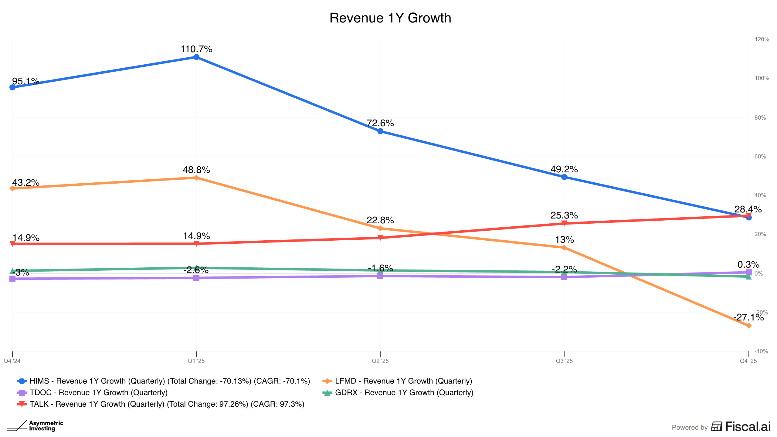 …but it is growing faster than everyone else. And Talkspace (in red above and below) is being acquired by Universal Health Services.