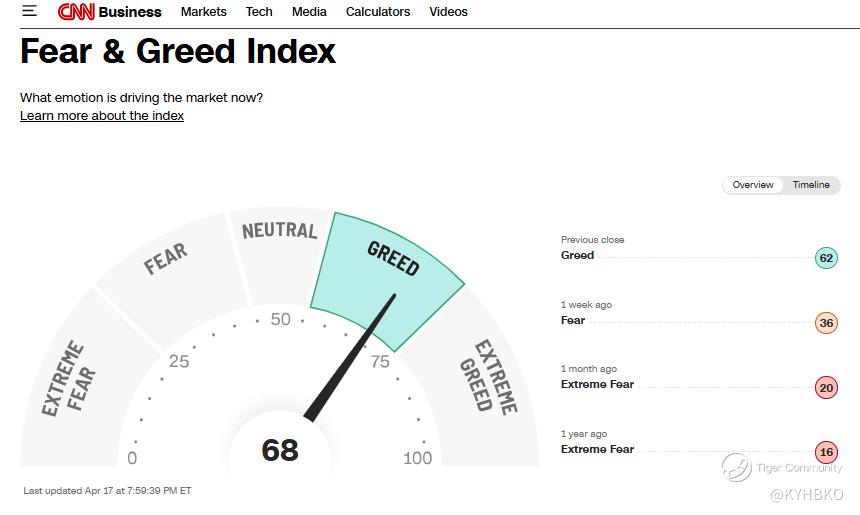 The CNN Fear and Greed Index, which gauges prevailing market sentiment, is currently reading 68. This value falls within the “Greed” zone, indicating that investor sentiment is leaning towards optimism and risk-taking.