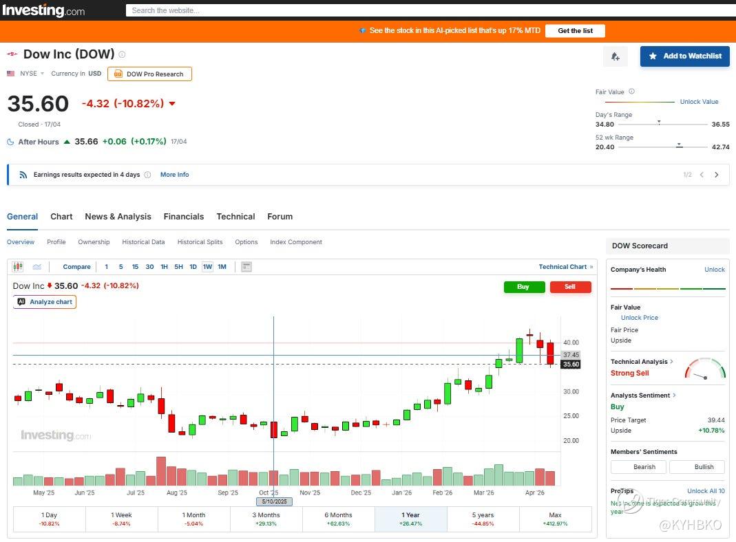 Dow Chemicals is of particular interest this week. Over the past year, Dow’s stock price has risen by 26.47%, reflecting strong performance. Despite this upward trend, technical analysis currently suggests a “strong sell” recommendation, indicating that the stock may be overvalued or facing near-term challenges.