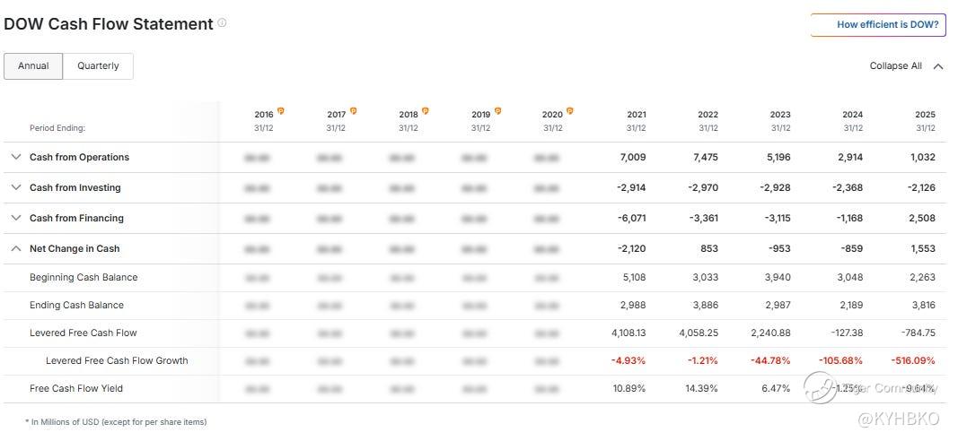 Dow Chemicals’ cash flow statements further highlight the company’s ongoing financial challenges. Cash from operations experienced a substantial decline, dropping from $7 billion in 2021 to just $1 billion in 2025. This sharp reduction indicates mounting pressure on the company’s ability to generate operating cash flow.