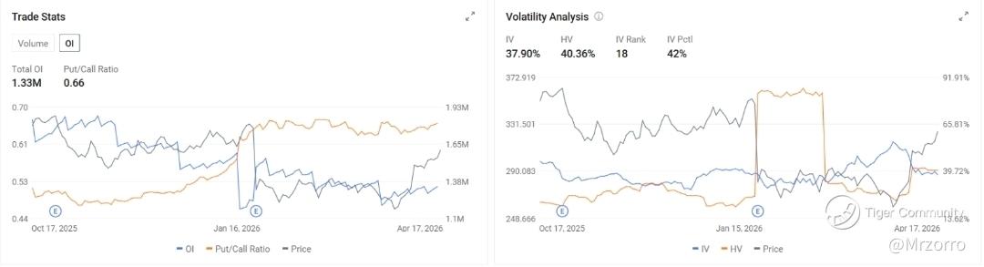 UNH's options setup suggests caution, but not outright panic, ahead of earnings. Open interest stands at about 1.33 million contracts, while the put-call ratio at 0.66 still points to a call-heavy market overall, even though the ratio has been trending higher versus late 2025, indicating that downside hedging has picked up as the stock heads into its April 21 report. At the same time, implied volatility around 37.9% sits slightly below historical volatility of 40.4%, with IV Rank at 18 and IV Percentile at 42%, which means option premiums are elevated enough to reflect event risk, but not stretched enough to suggest extreme fear or crowded downside protection. That fits with broader earnings-event pricing, as traders are currently bracing for roughly a 5.7% to 6.0% post-results move in either direction.