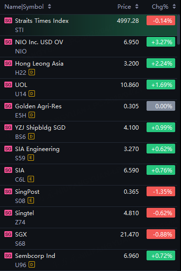 Singapore stocks opened lower on Tuesday. STI down 0.1%; Nio up 3%; UOL up 2%; SIA up 1%.