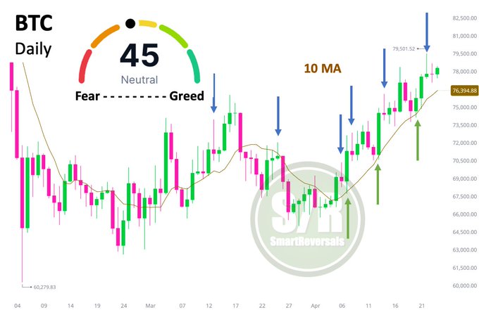 The 10-day moving average is carrying this move and the price is far from greed. Don’t rule out a test of $80.6K within the next couple of days if $77,6K is conquered.