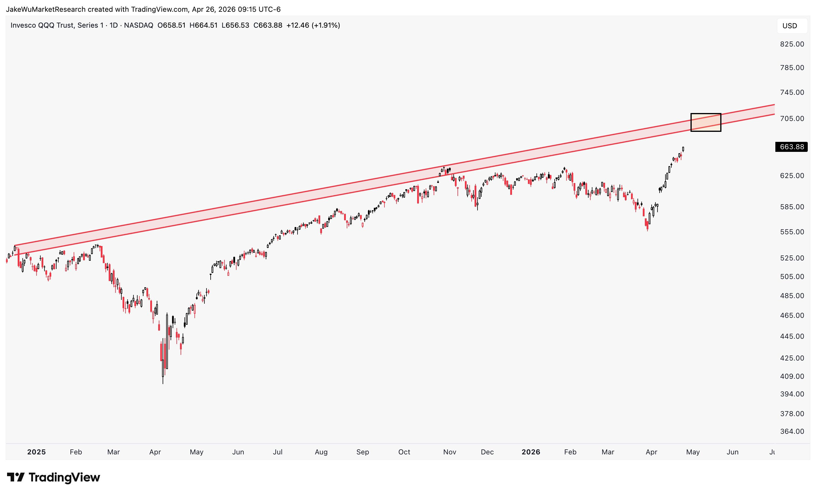 $Invesco QQQ(QQQ)$ $NASDAQ 100(NDX)$ Wouldn't be shocked in the least bit to see the market melt straight up to this diagonal trend zone in the coming 1-2 weeks.