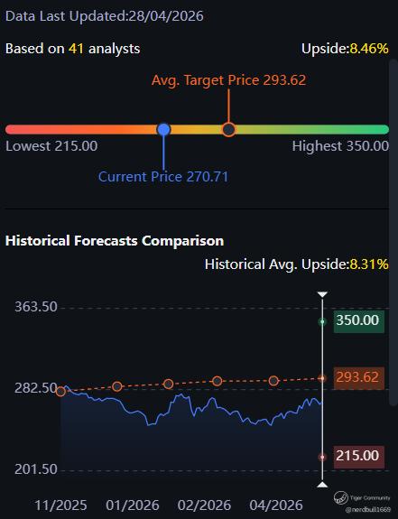 Based on 41 analysts from Tiger Brokers app offering 12 month price targets for Apple in the last 3 months. The average price target is $293.62 with a high forecast of $350.00 and a low forecast of $215.00. The average price target represents a 8.46% change from the last price of $270.71.