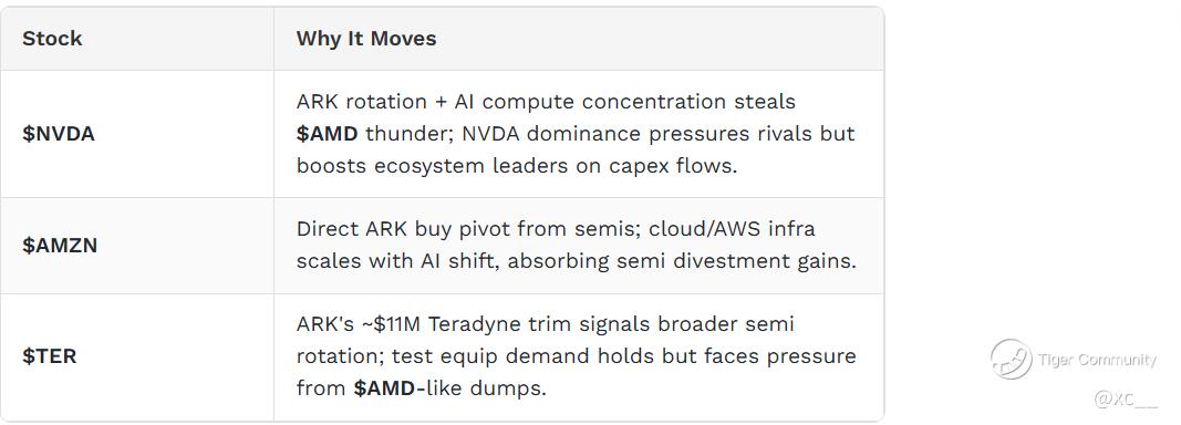 Ecosystem shift: ARK pivots from semis to $AMZN/others amid NVDA capex crush; $AMD RSI 80-88 (overbought, e.g., 80.25 GuruFocus, 88.93 Moneycontrol) eyes pullback to $347 support, MACD bullish.
