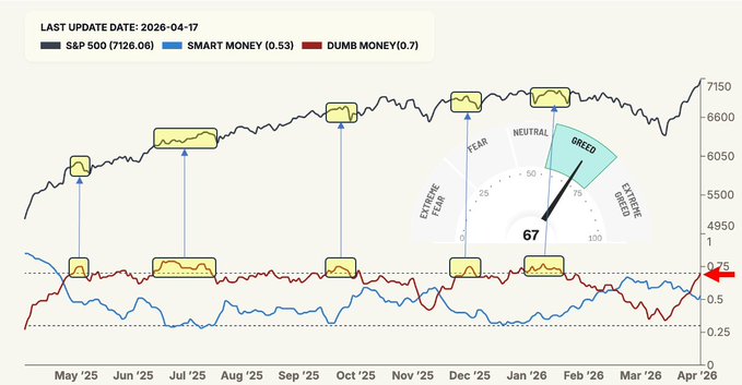 Furthermore, the Fear & Greed Index sits at 67 (Greed), while Smart Money Confidence is neutral ahead of major earnings reports.