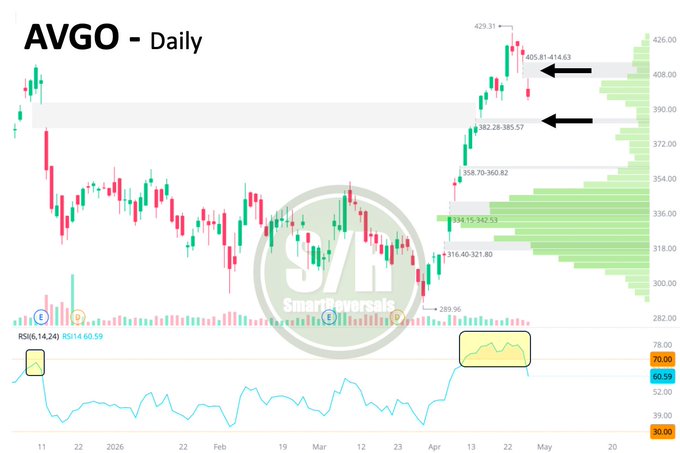 As highlighted in the Weekly Compass, Broadcom was very overbought. A loss of 415 would trigger a move toward 401, which is the current case.