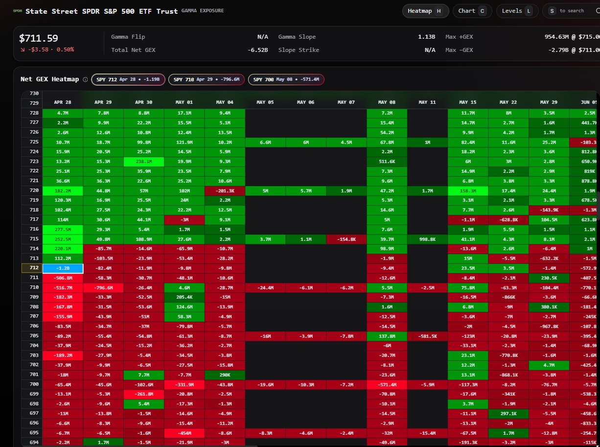 $SPDR S&P 500 ETF Trust(SPY)$ at 711.6 heavy negative gamma, unstable structure, downside pressure building