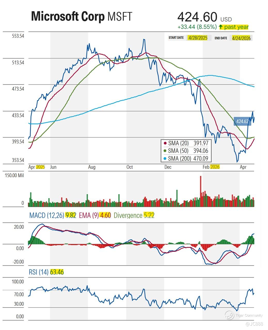 On Fri, 24 Apr 2026, MSFT closed off the week at $424.60 /share; that is higher than its 20-day SMA ($391.97) and 50-day SMA ($391.97), clearly indicating that stock regained control over the near-term tape.