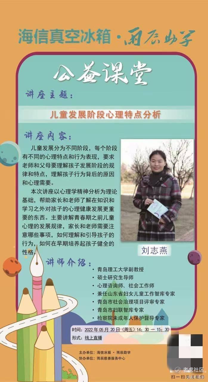 家有兒女初長成,父母和老師一邊歡喜一邊憂。5月20日,海信真空冰箱·雨辰助學邀請青島理工大學劉志燕教授,以《兒童發展階段心理特點分析》爲主題,通過網上公益課堂,展開了一場針對孩子的“發現之旅”。