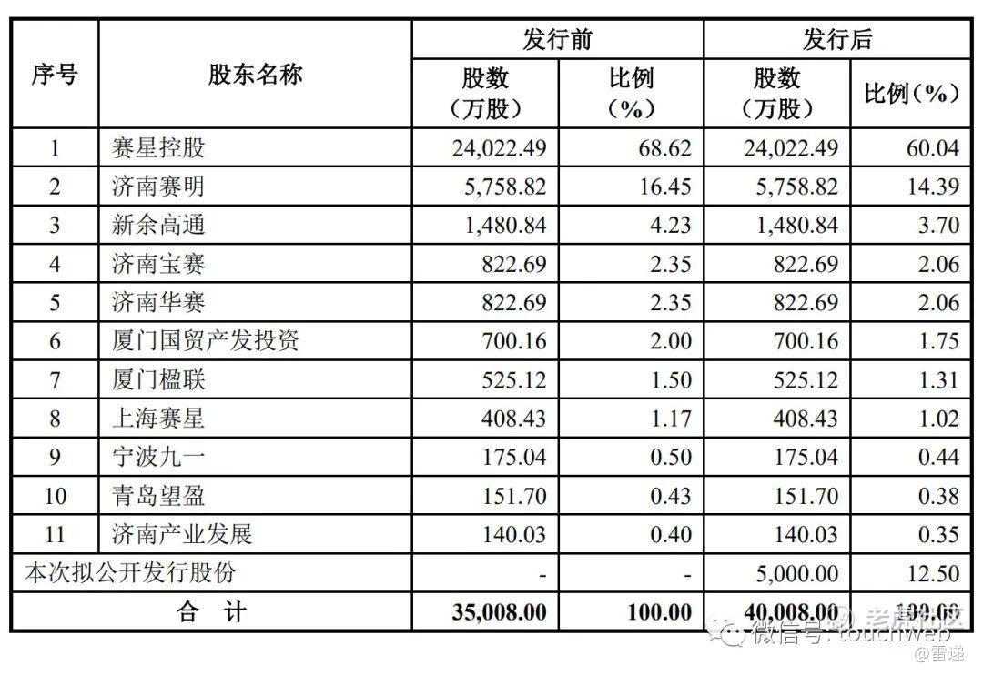 IPO後,賽星控股持股爲60.04%,濟南賽明持股爲14.39%,新餘高通持股爲3.7%,濟南寶賽、濟南華賽分別持股爲2.06%,廈門國貿產發投資持股爲1.75%,廈門楹聯持股爲1.31%,上海賽星持股爲1.02%,寧波九一持股爲0.44%,青島望盈持股爲0.38%,濟南產業發展持股爲0.35%。