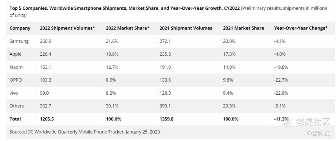 表現不甚樂觀的,並不止國內手機市場。根據IDC最新報告顯示,2022年第四季度,全球智能手機出貨量同比下降18.3%至 3.003 億部。而從年度數據來看,2022全年智能手機出貨量全年大幅下滑11.3%至12.1億部,這是自2013年以來的最低年度出貨量。
