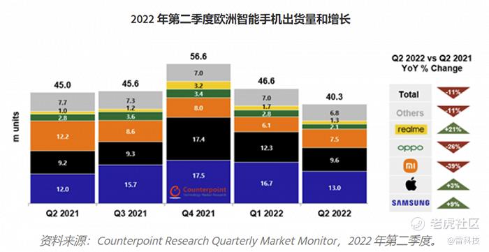 具體到廠商方面,從2022年年間數據來看,蘋果、三星、小米、OPPO、vivo前五大廠商集體出現暴跌,無一倖免。其中,傳統國際巨頭三星、蘋果分別下滑4.1%、4%,市場份額依然位列前兩位,國產廠商小米、OPPO、vivo則分別下滑19.8%、22.7%、22.8%。