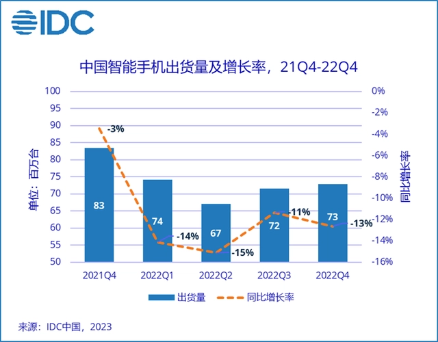 根據國際數據公司IDC最新發布的手機季度跟蹤報告顯示,2022年第四季度,中國智能手機市場出貨量約7292萬臺,同比下降12.6%;2022年全年中國智能手機市場出貨量約2.86億臺,同比下降13.2%,創有史以來最大降幅。這也是10年以來,中國智能手機出貨量首次跌破3億臺大關。