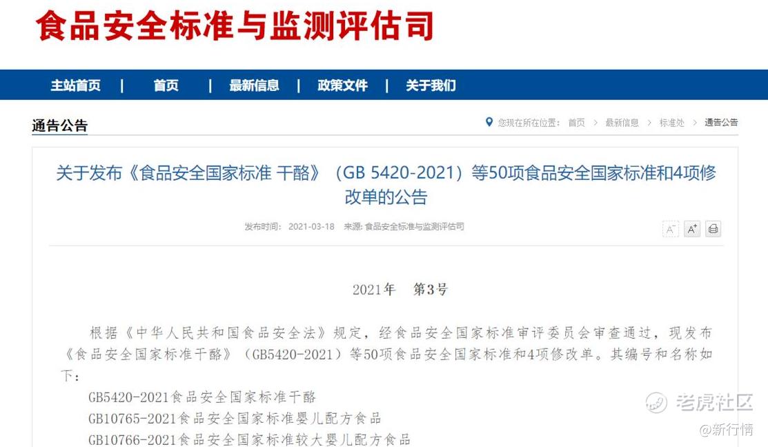 2021年3月18日,國家衛生健康委官網發佈50項食品安全國家標準。其中,《食品安全國家標準嬰兒配方食品》(GB 10765-2021)、《食品國家安全標準較大嬰兒配方食品》(GB 10766-2021)和《食品安全國家標準幼兒配方食品》(GB 10767-2021)三大標準,被業內稱爲“史上最嚴”的嬰幼兒奶粉“新國標”。