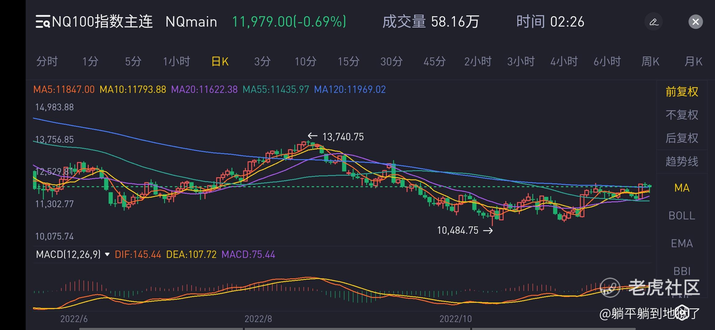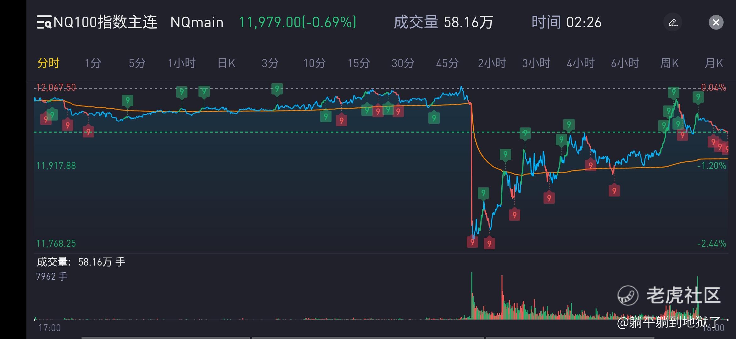 昨日分時走勢:美東時間12月1日18:00NQ100期貨開盤略微回探60分鐘橫盤強勢整理箱體底部後,21:00後小幅振盪攀升,表現出了對將公佈的非農數據的謹慎。直到12月2日08:30之前NQ100期貨完全在預期內運行。在壓力位12月1日高點12145點,支撐位12月1日低點11943.25點之間做強勢整理。8:30至日內高點12067.75後,非農數據公佈好於預期,股指直線跳水,9:00至日內低點11740.5點,短暫破5日均後快速收回,振盪反彈。9:30美股開盤後,隨美股一路振盪反彈,尾盤報11987.88點,-0.62%,縮量收長下影線小陰線,收盤在120均之上。一夜驚魂。