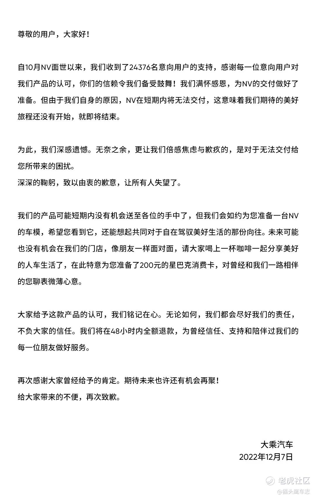 NIUTRON 汽車今日發佈“致 NV用戶的一封信”,就NV在短期內將無法交付作出聲明。聲明中稱:由於自身原因,NV在短期內無法交付,將在48小時內向24376名意向金用戶全額退款。此外,官方還將爲這批准車主贈送一個NV車模和200元星巴克消費卡以示歉意。