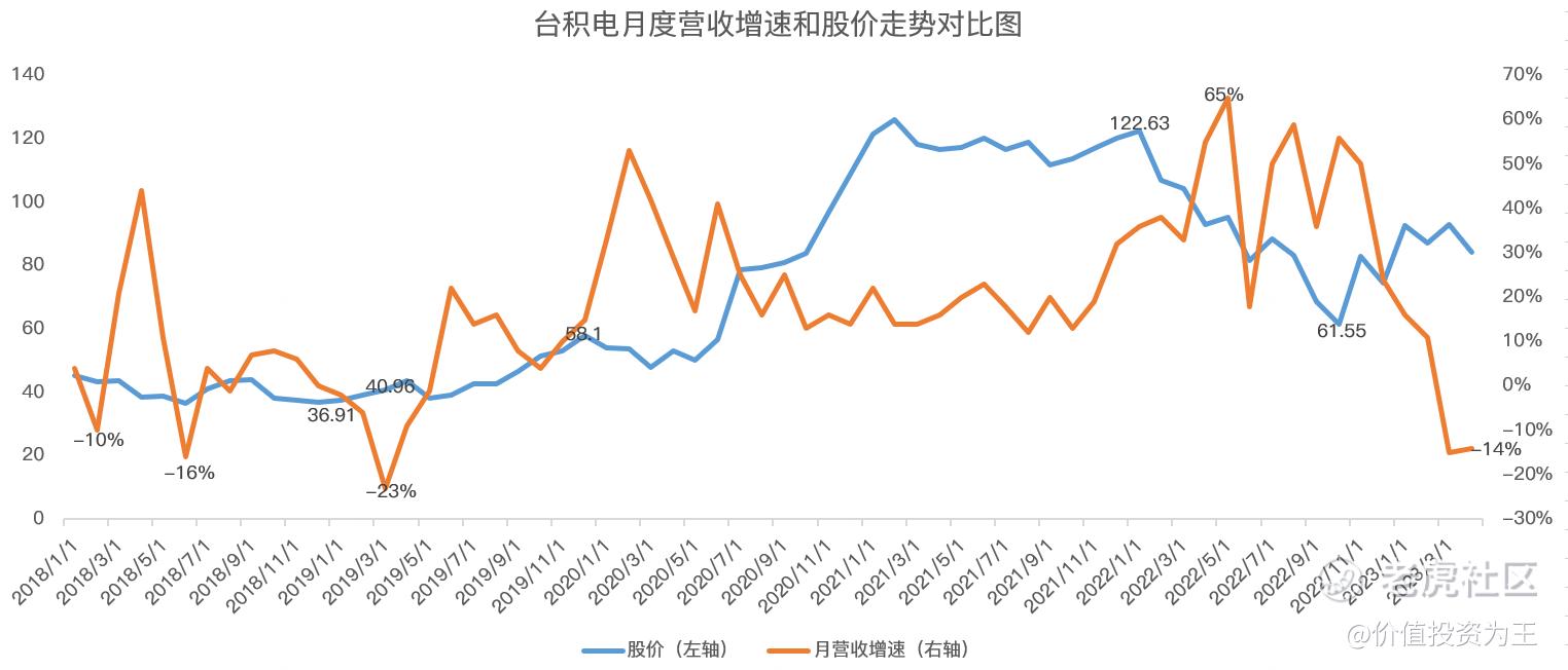 根據臺積電公佈的月度銷售數據,其4月份營收下滑14%,根據2018-2019年半導體下行週期時的股價表現,當臺積電月度收入負增長時,恰好是股價的低點: