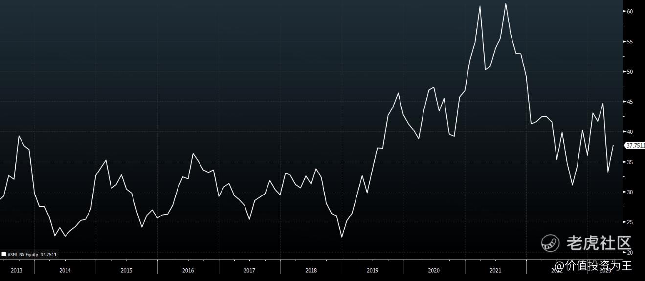 最後聊聊阿斯麥,雖然它是光刻機霸主,不管是英偉達還是AMD,最後都得由阿斯麥的光刻機來生產,但阿斯麥目前最大的問題就是估值不便宜: