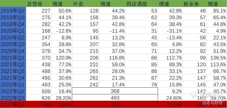 說明:2022年Q4數據爲預測值,核心本地商業既包含了外賣、到店酒旅,也包含了原先屬於新業務的閃購、民宿和交通票務,所以增速比實際要高,同理原先(2021年Q4)的新業務包含了上述三項調整業務,2021年147億的基數調整後同比數值33%纔是合理的。