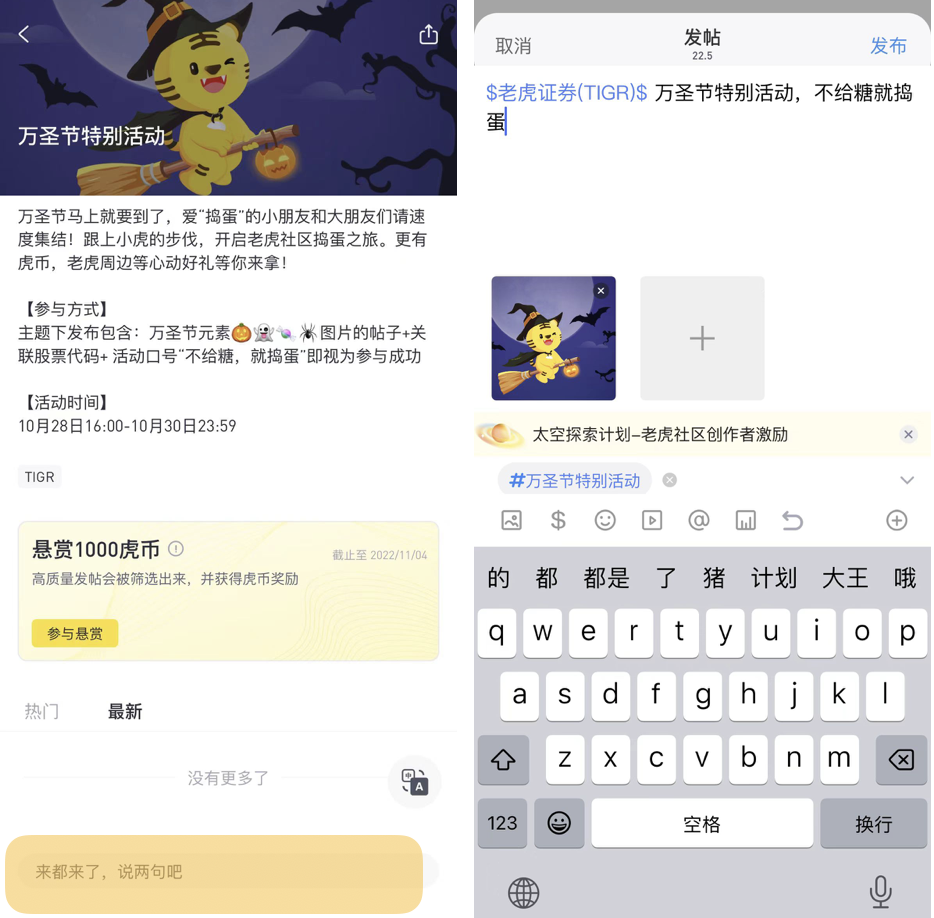 “萬聖節特別活動”主題下發布包含:萬聖節元素🎃👻🍬🕷圖片的帖子+關聯股票代碼+ 活動口號“不給糖,就搗蛋”即視爲參與成功。如下圖
