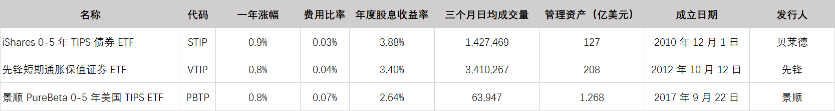 $(TIPS)$ $iShares Barclays 0-5 Year TIPS B(STIP)$ $Vanguard Short-Term Inflation-Protected Securities Index Fund ETF Shares(VTIP)$ $Invesco PureBeta 0-5 Yr US TIPS ETF(PBTP)$Disclaimer: Investing carries risk. This is not financial advice. The above content should not be regarded as an offer, recommendation, or solicitation on acquiring or disposing of any financial products, any associated discussions, comments, or posts by author or other users should not be considered as such either. It is solely for general information purpose only, which does not consider your own investment objectives, financial situations or needs. TTM assumes no responsibility or warranty for the accuracy and completeness of the information, investors should do their own research and may seek professional advice before investing.