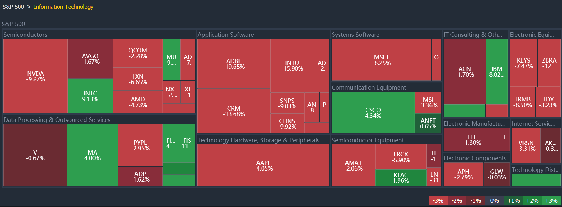 Inside the sector,the Large/Megacap tech stocks(market capitalization above $200 billion)were declined quite obviously in the past month:$(NVDA)$ declined 9.27%,$(MSFT)$ fell by 8.2%, $(AAPL)$ fell by 4.05%,$( ADBE)$ fell by 19.6%,$( CRM)$ fell by 13.6%, $(PYPL )$fell 2.95%,$(INTU)$ fell by 15.9%,$(AMAT)$ fell 2%,$(QCOM)$ fell By 2.28%$(,CDNS)$ fell by 9.9%, $(TXN)$ fell by 6.6%, $( AVGO)$ fell by 6% and etc……