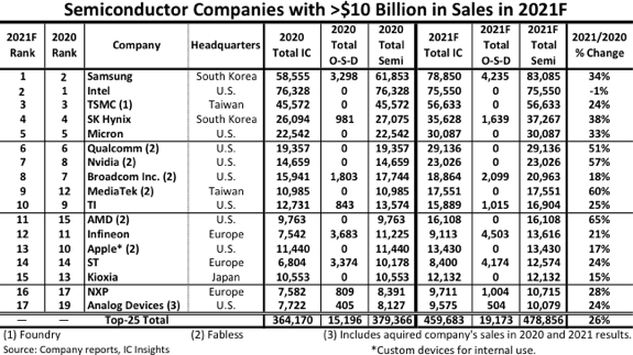 Based on IC Insights report: 2022 Semiconductor Sales Expected to Grow 11% After Surging 25% in 2021