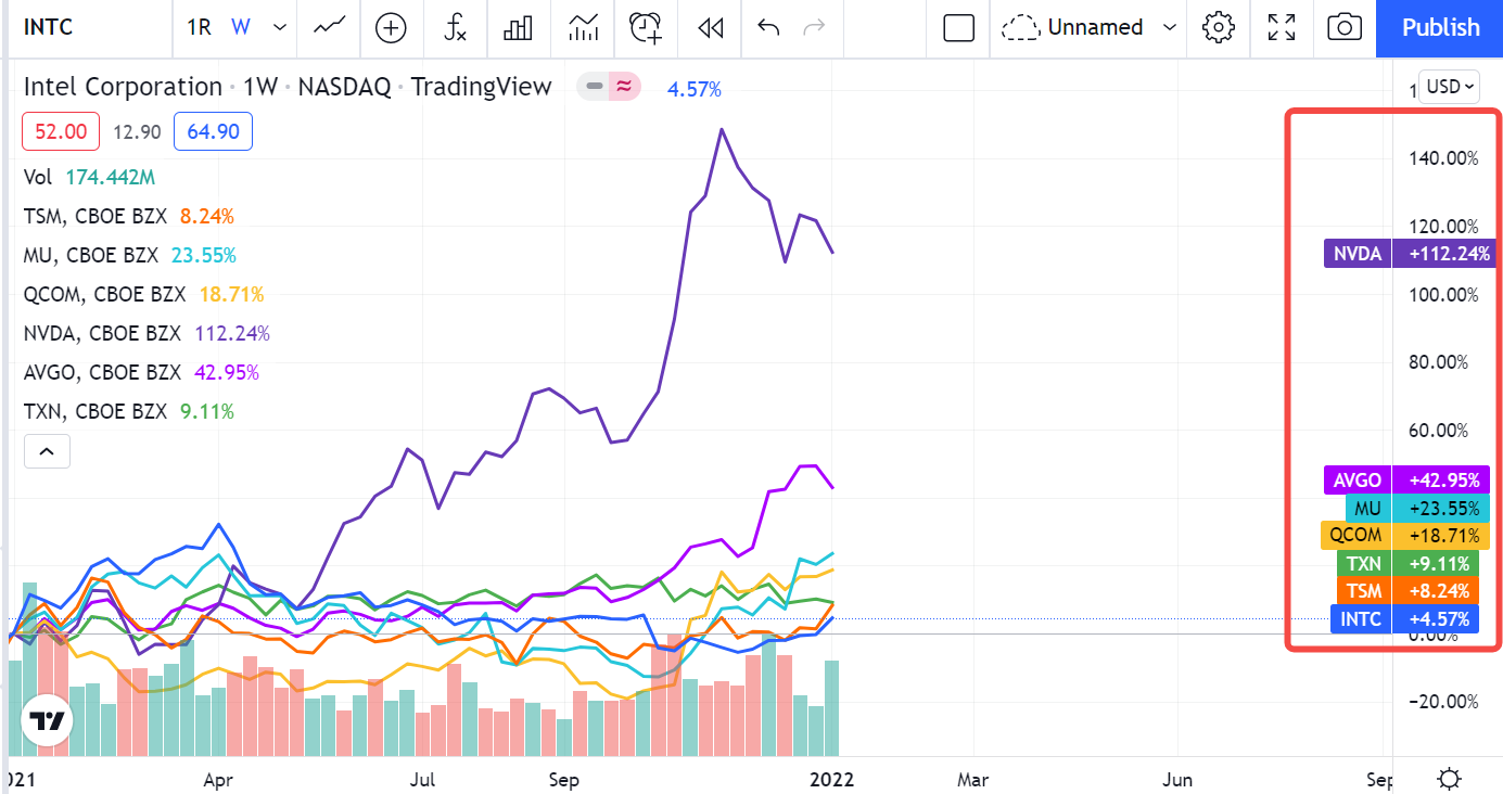 Calculated by tradingview.com, from January 4th, 2021 to January 6th, 2022, $(NVDA)$ increased by 112.2%, $(AVGO)$ increased by 42.95%,$( MU)$ increased by 23.55%, $(QCOM)$ increased by 18.71%, $(TXN)$ increased by 9.1%, and$( TSM)$ increased by 8.24%, $(INTC)$ rose 4.5%.