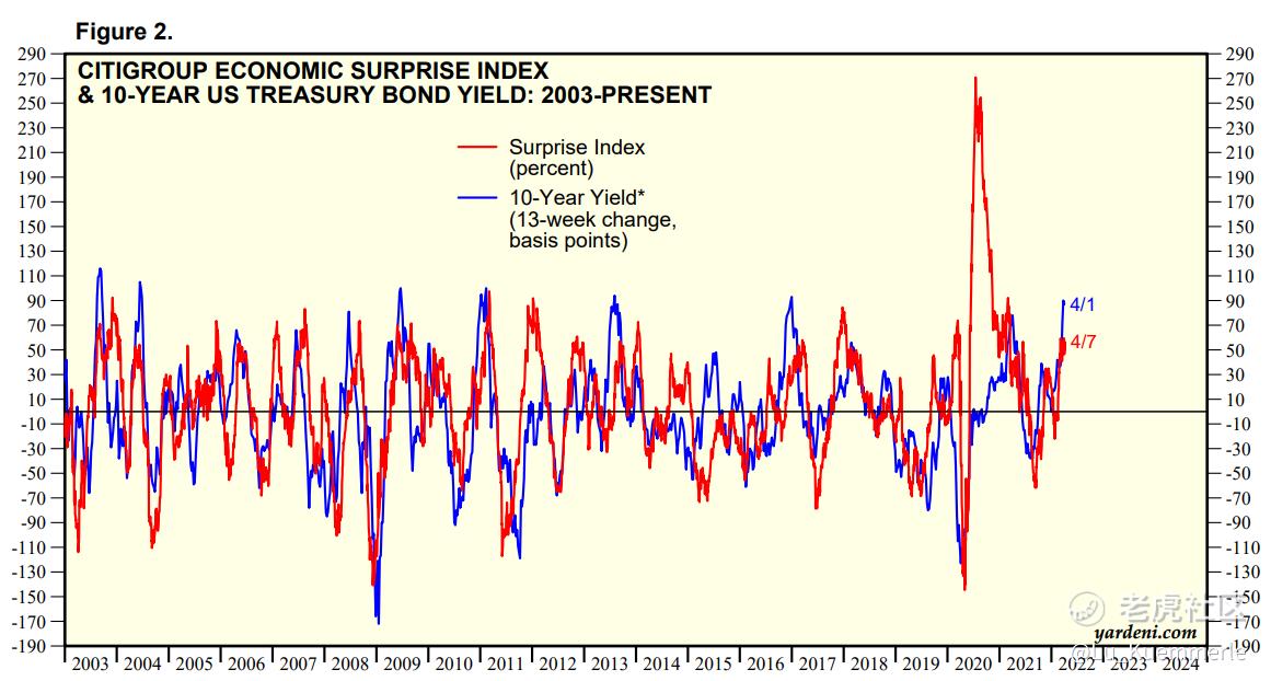From a technical perspective 10Y treasury yields are very overstretched. This chart by Yardeni Research confirms that view. On a 13-week change basis, we’re now in regions where the rate of change usually tends to top out and reverse to the downside again. Moreover, the Citi Economic Surprise Index is confirming that aspect as well.