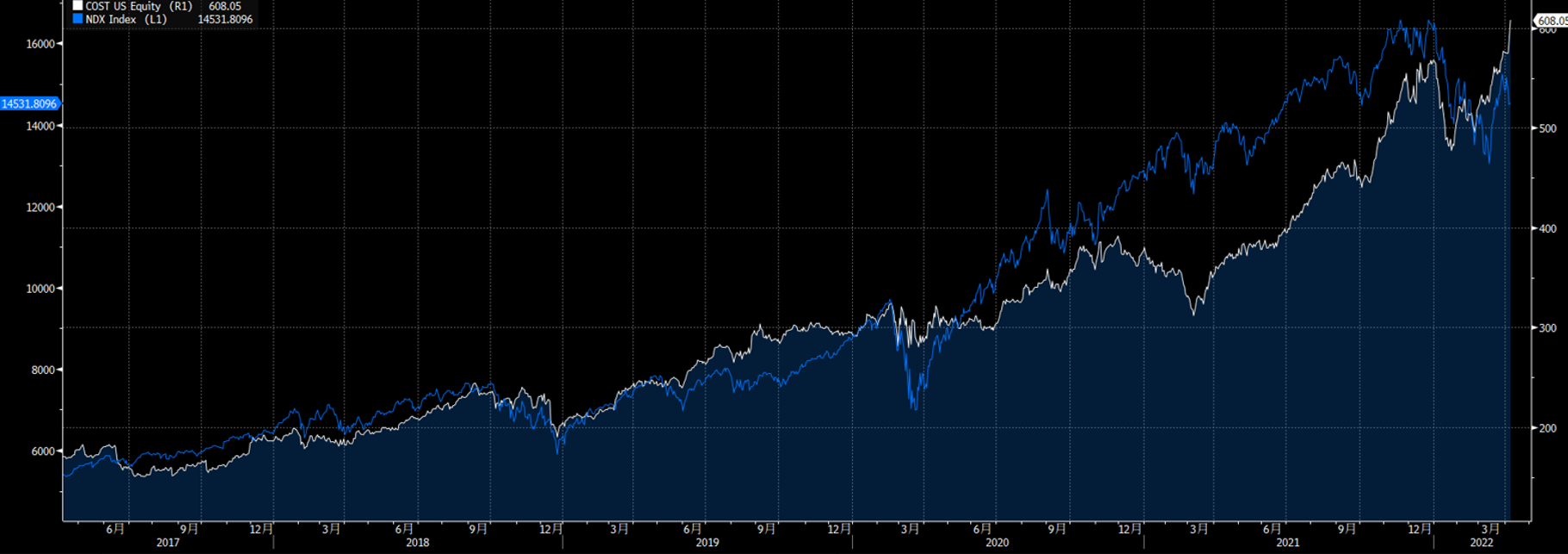 Costco, for another example, significantly underperformed the Nasdaq 100 index from 2020 to 2021: