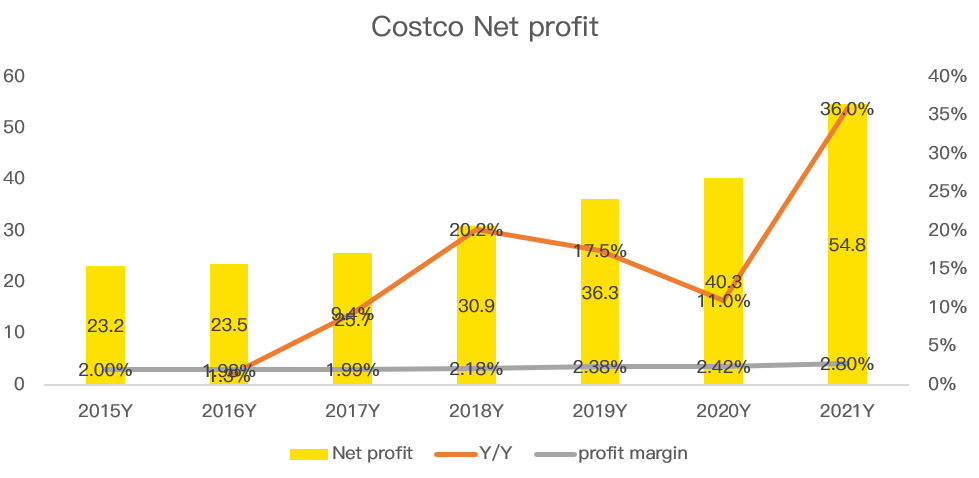 However, from the profit side, Costco's rapid growth in recent years is mainly due to the improvement of profitability, in which the net interest rate increased from 1.99% in 2017 to 2.8% in 2021: