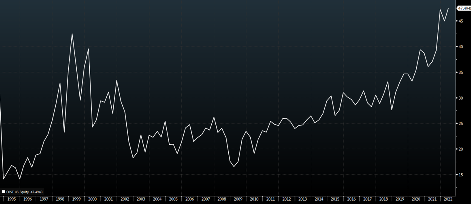 However, under the historical high of supermarket stocks, we have to beware of the risk of high valuation. At present, Costco's dynamic price earnings ratio (TTM) is as high as 47 times, which is at an all-time high: