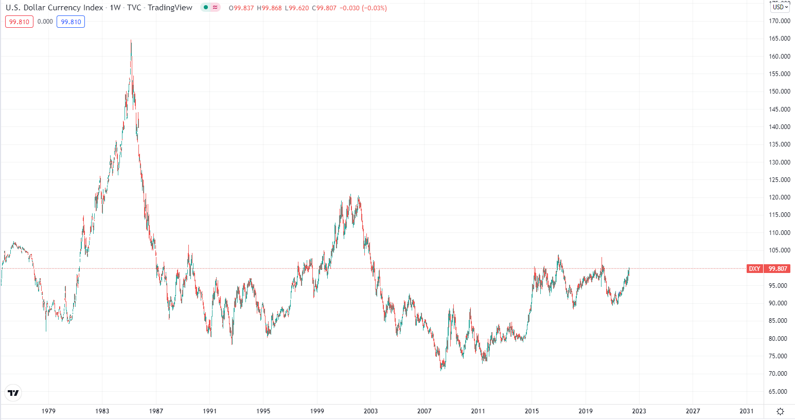 Last week, the US dollar index briefly hit the 100 integer mark, which broke through 100 again since May 2020. For a long time, the dollar has behaved closer to commodities-showing a trend of mean reversion, fluctuating around the median,When the price is too low, it will rise, and when the price is too high, it will fall. In terms of current prices, there is still 10-20% room from the long-term median.