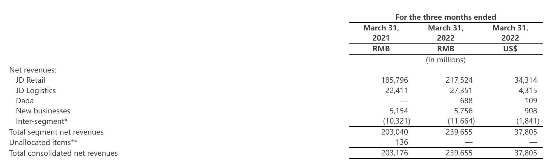 Among them, the retail business achieved a revenue of 217.5 billion, a year-on-year increase of 17%; JD logistics achieved a revenue of 27.35 billion, a year-on-year increase of 22%; New business increased by 12% year-on-year;