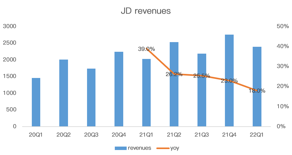 From the perspective of revenue, although it exceeded market expectations in the first quarter, the growth rate of jd.com Q1 slowed down both in terms of overall growth and business.