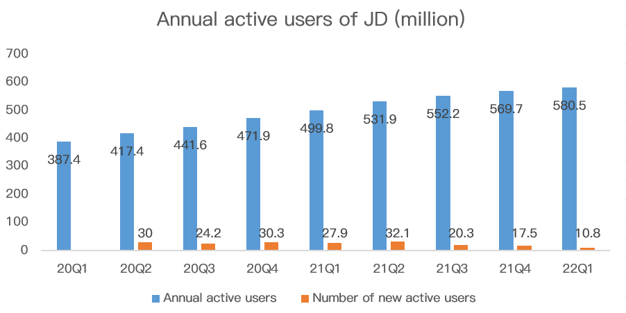 After talking about revenue, let's look at the client. In the first quarter of this year, the number of active users of JD reached 580.5 million, with a year-on-year increase of 10.8 million.