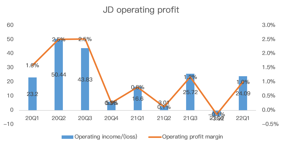 In the first quarter, JD's operating profit was 2.4 billion, a year-on-year increase of 45%, and the operating profit margin increased from 0.8% to 1%: