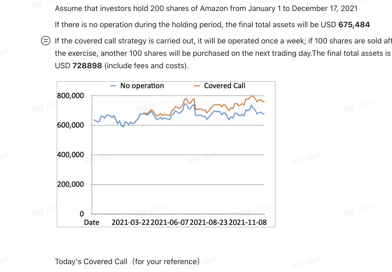 If the covered call strategy is carried out, it will be operated once a week; if 100 shares are sold after the exercise, another 100 shares will be purchased on the next trading day.The final total assets is USD 728898 (include fees and costs).