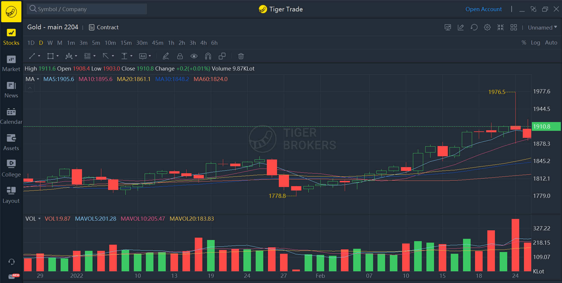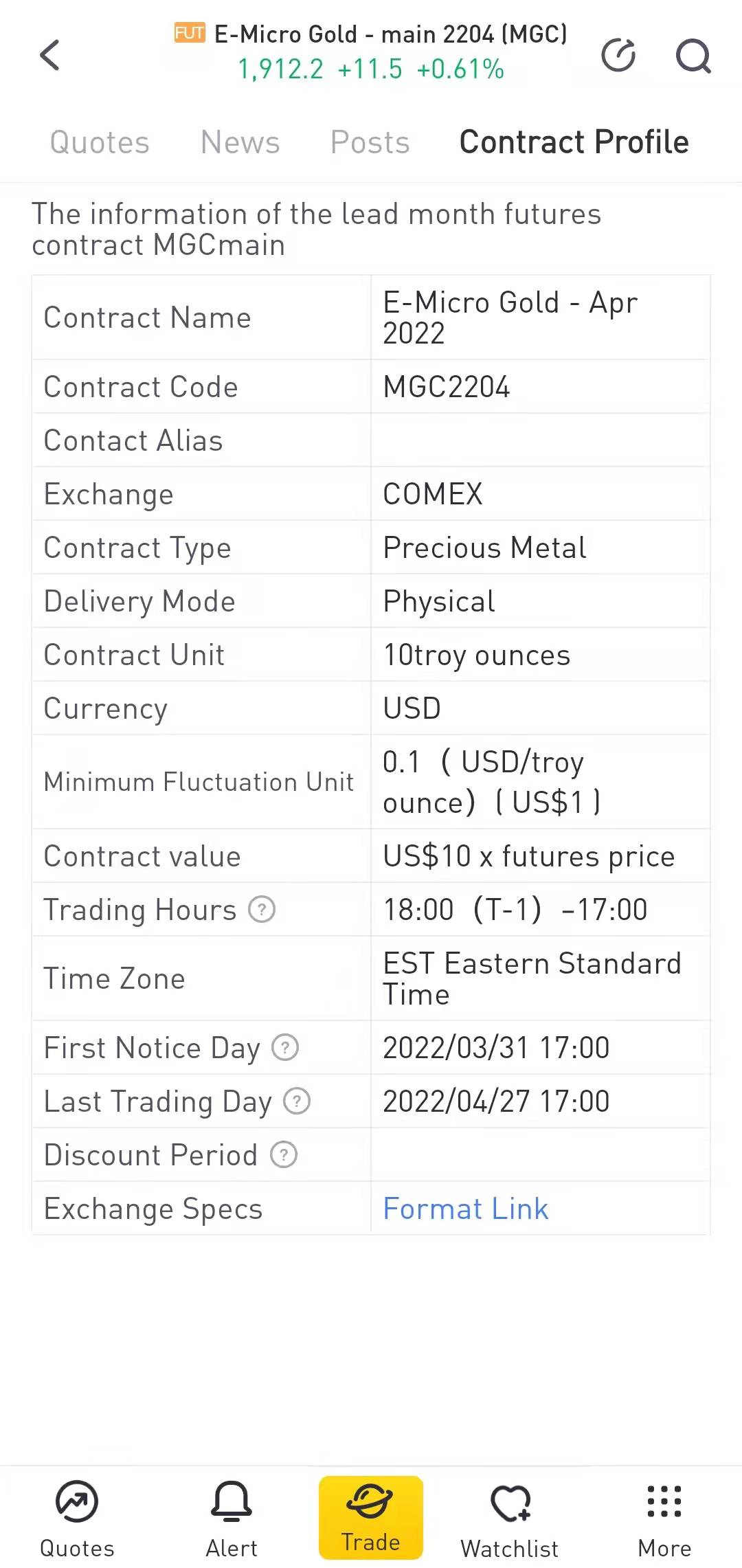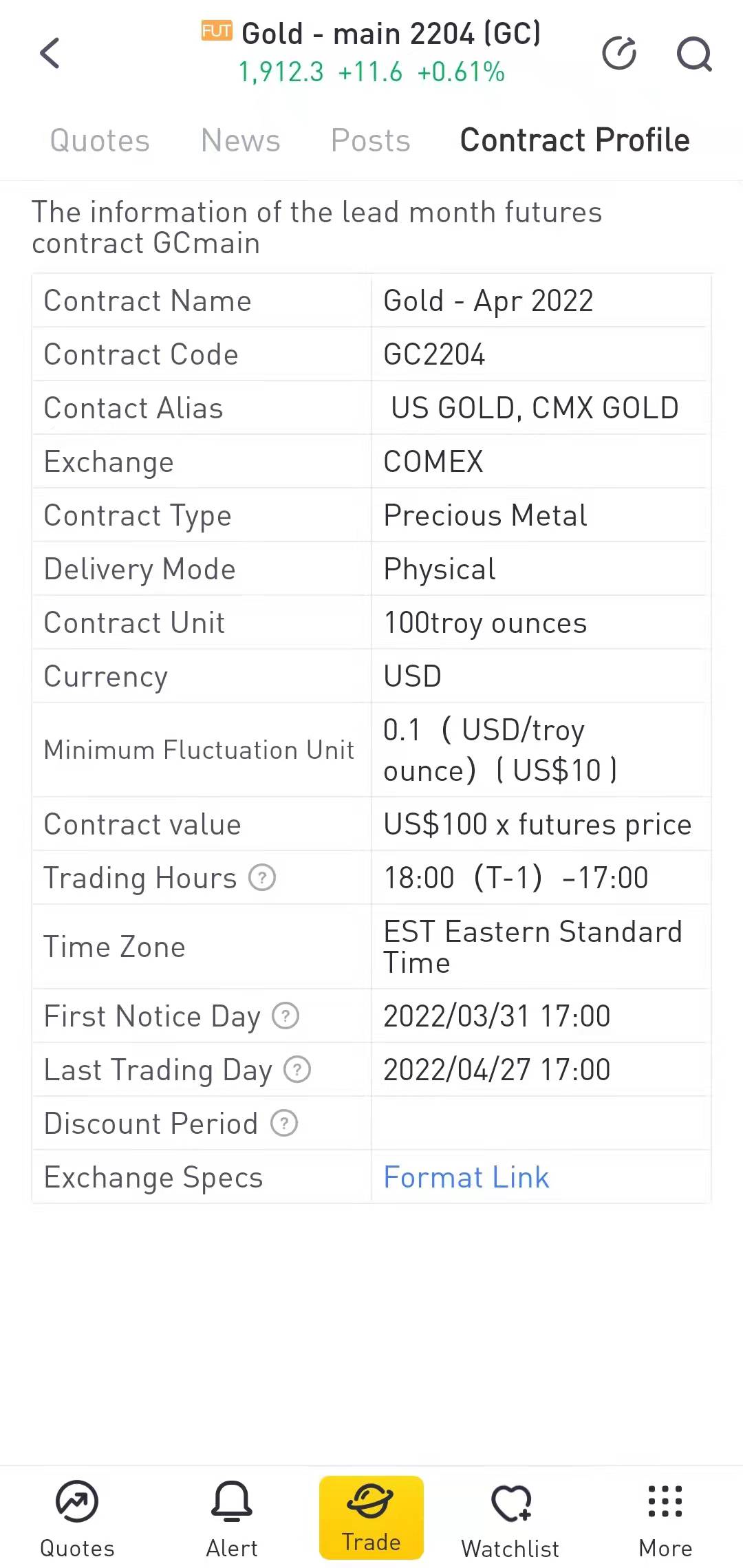 Let's take a look at the minimum volatility of $Gold - main 2204(GCmain)$. We can check the contract profile on the Tiger app. The contract unit is 100 troy ounces. The minimum fluctuation unit of the GC contract is 0.1 (USD/oz), equivalent to $10. In other words, when the price goes up or down, you profit or lose at least $10.