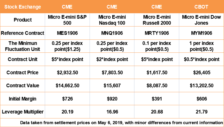 For example, if we take the settlement price on May 6, 2019 , the leverage multiplier of four micro E-mini index futures is as follows: