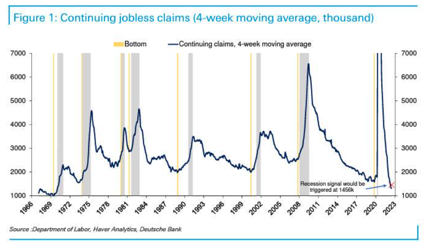 Deutsche Bank analyst Jim Reid shared in a client note on Tuesday that what he sees as the best leading indicator for a recession in the U.S. is a continued increase in jobless claims. Jim Reid point out “However, it’s hard to see markets recovering if we see firm evidence of the recession.”