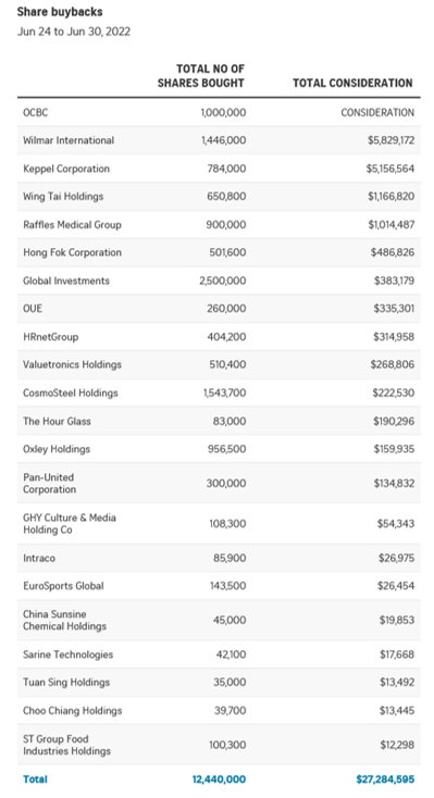 There were 22 primary-listed stocks conducting share buybacks over the 5 sessions ended Jun 30, with a total consideration of S$27.3 million, less than half the previous week’s consideration tally. $OVERSEA-CHINESE BANKING CORP(O39.SI)$ and $WILMAR INTERNATIONAL LIMITED(F34.SI)$ led the consideration tally, buying back shares at average prices of S$11.44, and S$4.03 respectively. There were as many as 35 primary-listed stocks that conducted buybacks for the month of June with a total consideration of S$284 million, down from the S$328 million consideration in May.