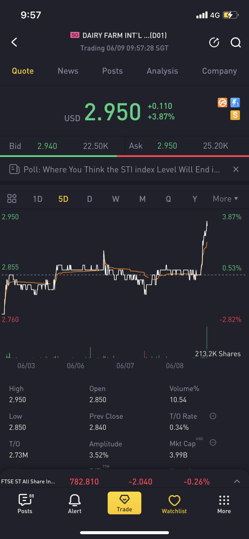 $DAIRY FARM INT'L HOLDINGS LTD(D01.SI)$Not sure what happen suddenly the share price shot up by more than 3% from USD 2.85 to USD 2.95 this morning. Please continue to go up to above USD 3.00, then I will be able to sell and make some profits.