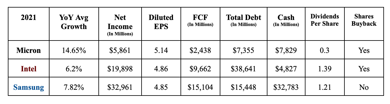 Micron: YoY growth is 14.65%, Net Income is positive (though Intel and Samsung earns more), Diluted EPS is (5.14), Generate FCF, negative Net Debt.