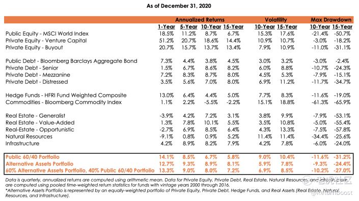 Here is what a properly diversified portfolio looks like in numbers: The CAIA looked at historic returns of various asset classes. It shows how the addition of alternative assets can add value to a traditional 60/40 portfolio. Adding alternatives to the mix leads to a similar performance but a much better risk level (lower volatility and lower drawdowns).